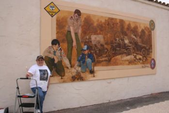 California based artist, Josie Figueroa, using acrylic paint on Dibond aluminum composite, painted the 8 by 16 foot mural. The use of a sign material and framing system allows the mural to be relocated at any time. The mural depicts an actual Troop One outing in the Sierras in 1915. Today, the United States Boy Scouts has over a million members.