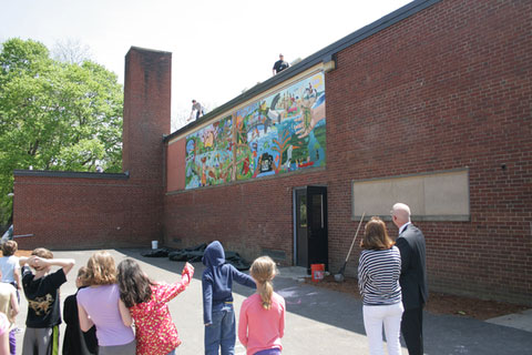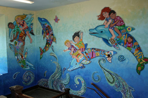 Our favorite of the painted murals is the one done for Ward Elementary School in Newton, Massachusetts using Dibond cutouts. Three walls of a stairway landing become a seascape of dolphins swimming and jumping out of ocean waves. Each dolphin takes on significance by representing a specific grade level. Within the body of the dolphins, a collage of student created artwork is framed. The students were given a special day to help participate in painting the mural.