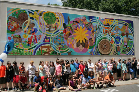David Fichter, a muralist, transforms student artwork into colorful collages and often uses Dibond aluminum composite material in the process. Three projects stand out near the artist’s hometown of Cambridge, Massachusetts in which Fichther worked with young artists to create the fantastical community murals.
