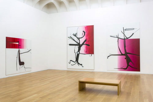 His trees, the progressive work of decades, as he describes them, “They are more simple and more complicated now,” he says. “When you place those black lines against a magenta background, something alarming happens. Magenta is a hysterical colour somehow. To me, they look like psychopathic trees – psychopathic humantrees.”