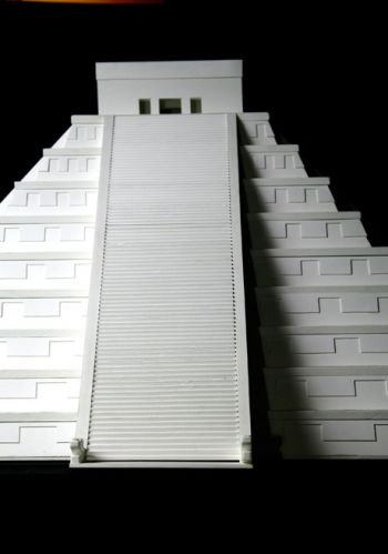 Kuijt has provided a detailed on-line chronicle describing the 35 hours he spent constructing the scaled pyramid at www.umiacs.umd.edu/~kuijt/dba105/Castillo/Castillo.html html starting with the base and vertical walls. Most pieces in the pyramid were cut with the table saw. The corners of the sloped walls were cut by hand with a jig. Architectural details, including two Kukulcan serpent heads, were hand cut with an artist’s knife. Pieces were glued together with PVC cement.