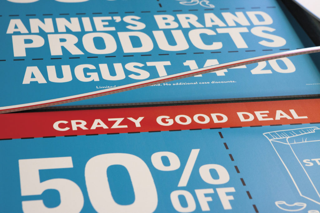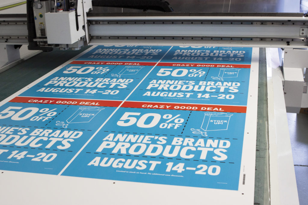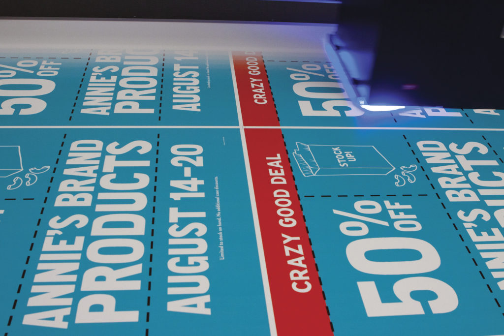 Digitype Design completes weekly print runs of short-term retail graphic interior signs, custom shapes installed as aisle markers and 4-by-4 foot double-sided posters. The company tested DISPA® in these projects, digitally direct-printing the embossed paper board on the company’s Vanguard Digital Printing Systems VK300D 5-by-10 foot flatbed printer with Vanguard UV inks. CNC routing was completed with a Colex SharpCUT SX Series digital flatbed cutter.