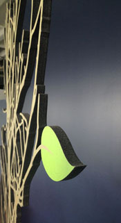 Para conocer los materiales respetuosos del medio ambiente en un rincón ” verde ” , el diseñador gráfico de CSI, Eric Seffinga, creó un diseño de casi 8 pies de altura que representa un árbol que sólo posee una hoja verde en medio y una serie de ramas torcidas marrones. El intrincado diseño – creado en Adobe Illustrator CS – ofreció a los empleados de CSI la oportunidad de probar el corte en Gatorfoam con una ruteadora Esko Kongsberg i- IXL24.