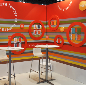 “In order to look like a substantial collection, I needed an innovative display; so, I chose circles and bold-colored stripes to make us stand out,” said Lawrence, who also needed the booth to be lightweight so that she and a friend could handle show setup.