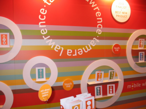 Remaining true to her mobile-infused brand, Lawrence self-designed her 8-foot by 10-foot trade show booth with white cut-out circular frame displays of Mobile Whimsy cards and easy-to-install colorful striped walls – all created with lightweight-yet-durable ½-inch thick Gatorfoam® graphic display board in the Bright White color and 48-by-96-inch sheet size.