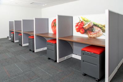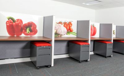 Green Clean Designs put The Chefs’ Warehouse Chicago office furniture in place in February, installing the FiberMate graphics on the back walls of the customer-service cubicles with 1.5-inch bolts that were screwed into the office furniture’s metal frames.
