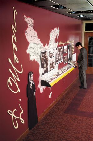 Children are drawn to the Lottie Moon wall display featuring a life-sized cutout of the petite 4-foot-3 missionary mounted on 6mm black Sintra graphic display board. While the only existing photos of Moon were headshots, Moore and PhotoWorksGroup were able to create a full-body image by combining Moon’s headshot with the body of a period-costumed model. An Océ LightJet 430 photo laser imager was used to print the combined image onto a textured thermal laminate that was mounted to the Sintra PVC board. The image was contour cut with a jigsaw and attached to the full wall display with an aggressive foam tape.