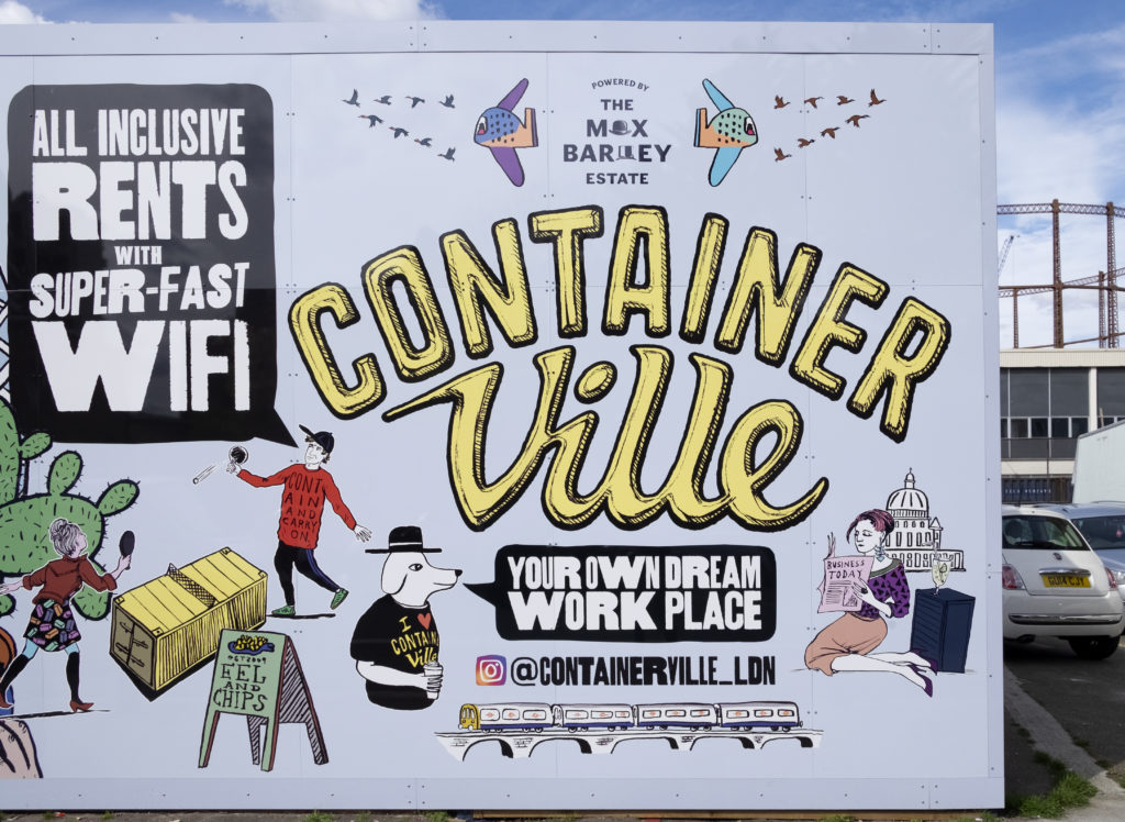 Containerville, a Max Barney Estate development, provides affordable self-contained office spaces for start-ups and small businesses in East London. A neighborhood formerly recognized as London’s manufacturing and industrial hub has been transformed over the years into a cultural arts and innovation center. A recent marketing campaign for the real-estate development utilized a hoarding design which adopts a trend-forward approach and speaks to the local community’s artistic fluency. The design was managed by Art Director and Partner at OneAnother, Paul Hamilton. Paul had previous experience branding former campaigns for The Estate Office Shoreditch and was contacted once again for the new development – Containerville, managed by a former Estate Office Shoreditch member and now entrepreneur of the Max Barney Estate. Paul commissioned Chris Bianchi and Stephanie Von Reiswitz from LeGun who also had experience in previous campaigns, to produce a palette of nearly 100 individual illustrations which would then be colored and combined to create a variety of marketing materials.