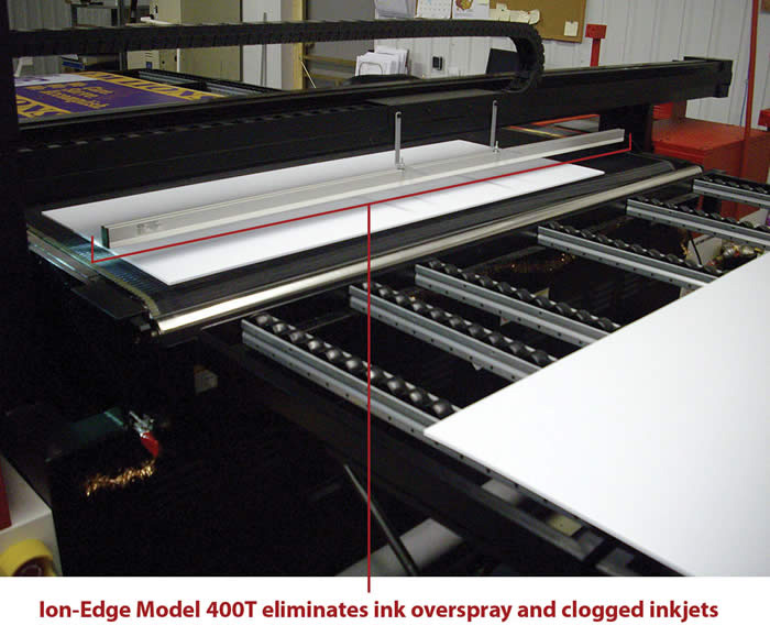 The photographs above show examples of print defects caused by static electricity on plastic material. The following is an example of ionization equipment that can be used to dissipate static electricity if controlling relative humidity in the printer area is not an option.