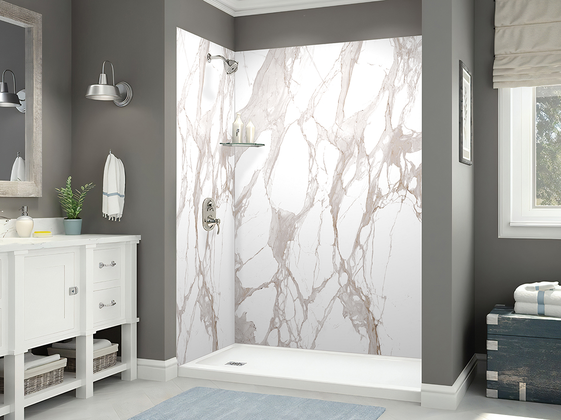 The Tile Look. A neutral and traditional look, this style offers the classic marble tile appearance without the time-consuming process of cutting, installing and grouting individual tiles. MONARC Tile Look panel finishes include Carrara Motif and Wheat Cream.
