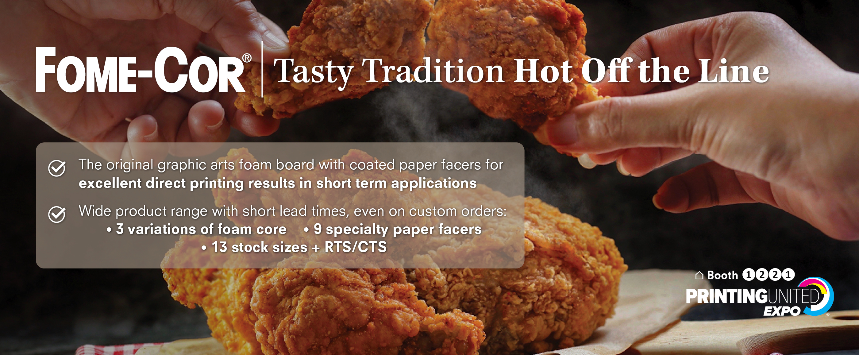 The FOME-COR Collection offers a variety of products with premium, bright white, double clay-coated facers which are ideal for screen and direct digital printing applications, as well as black and natural uncoated facers that provide flat, smooth surfaces for mounting graphics or backing photographs and fine art in framing applications. All FOME-COR products are produced using a proprietary manufacturing process that produces a foam core that is unsurpassed in cutting and fabrication capabilities, and delivers superior performance in both pillowing and recovery variations.