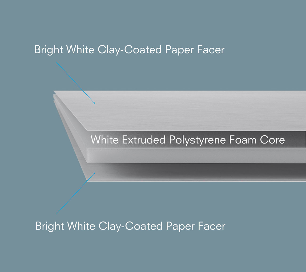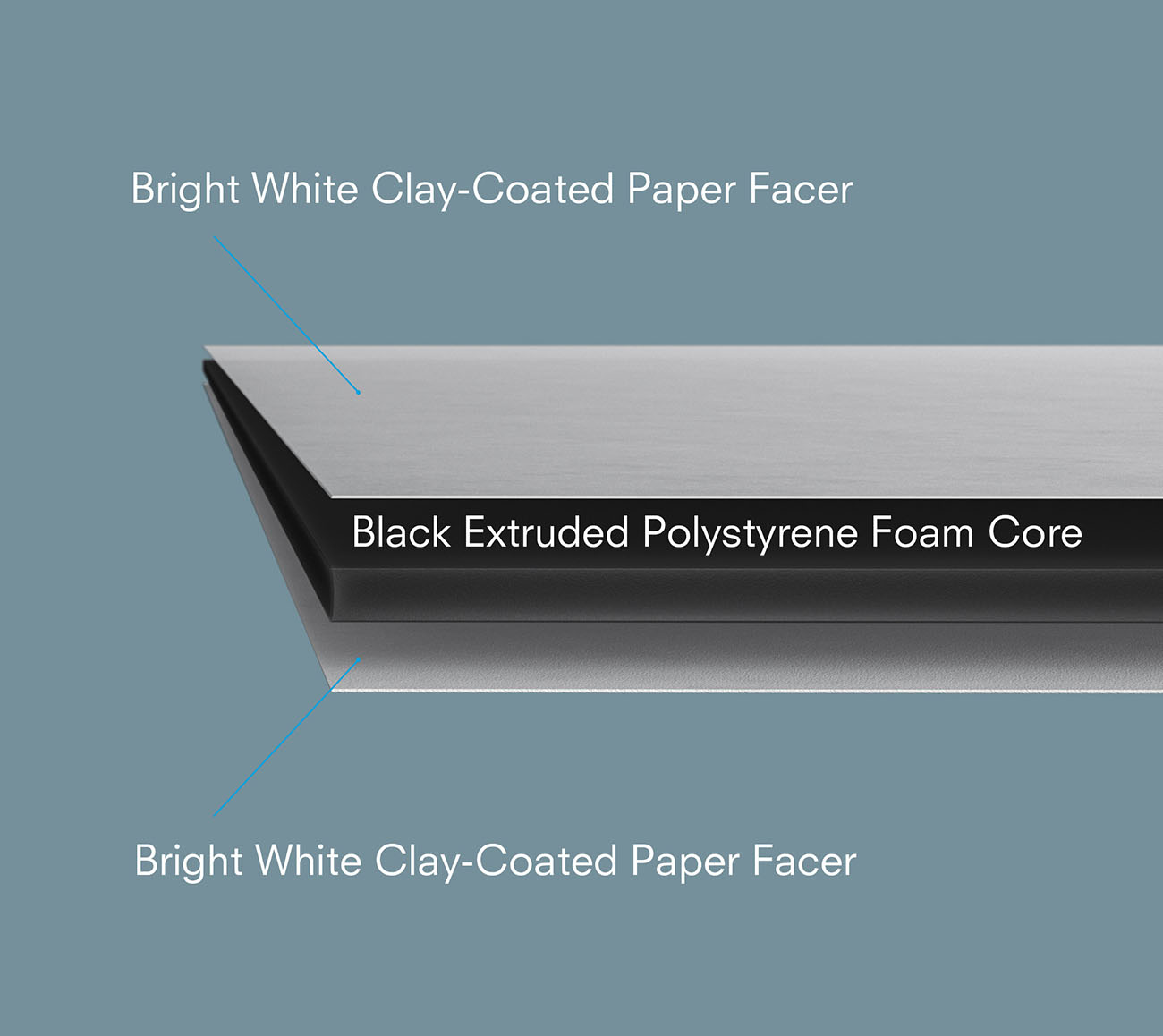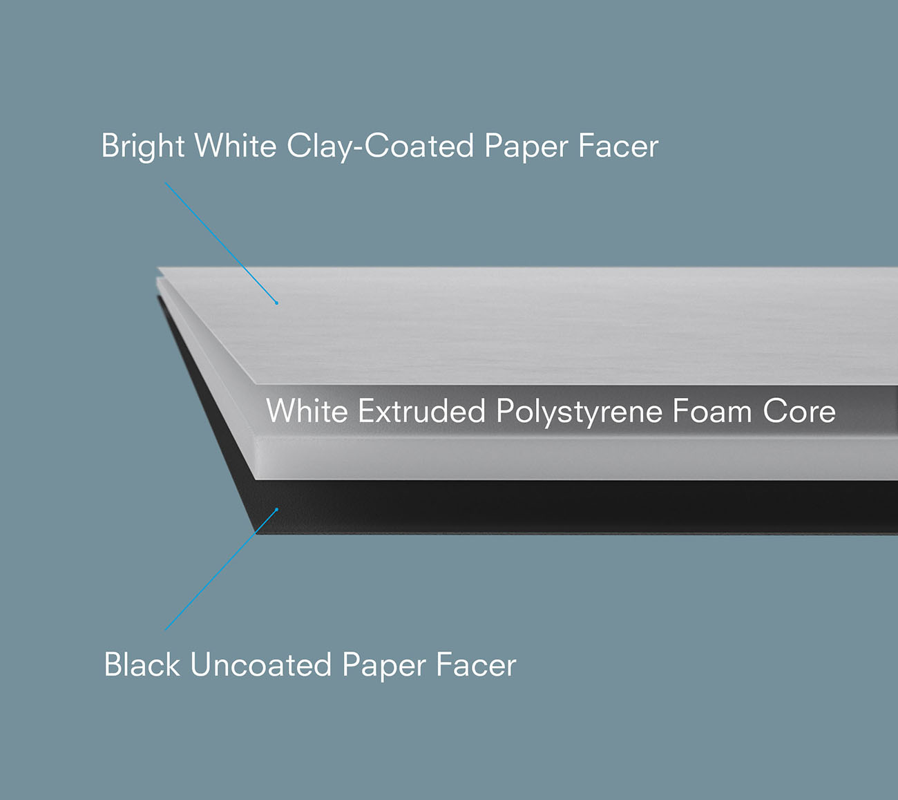 FOME-COR is comprised of extruded white or black polystyrene foam with bright white, double clay-coated or black uncoated paper facers. Made in the USA.