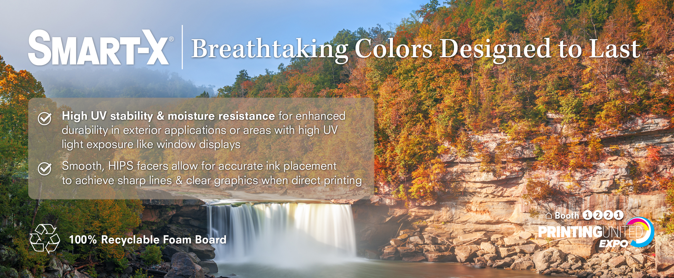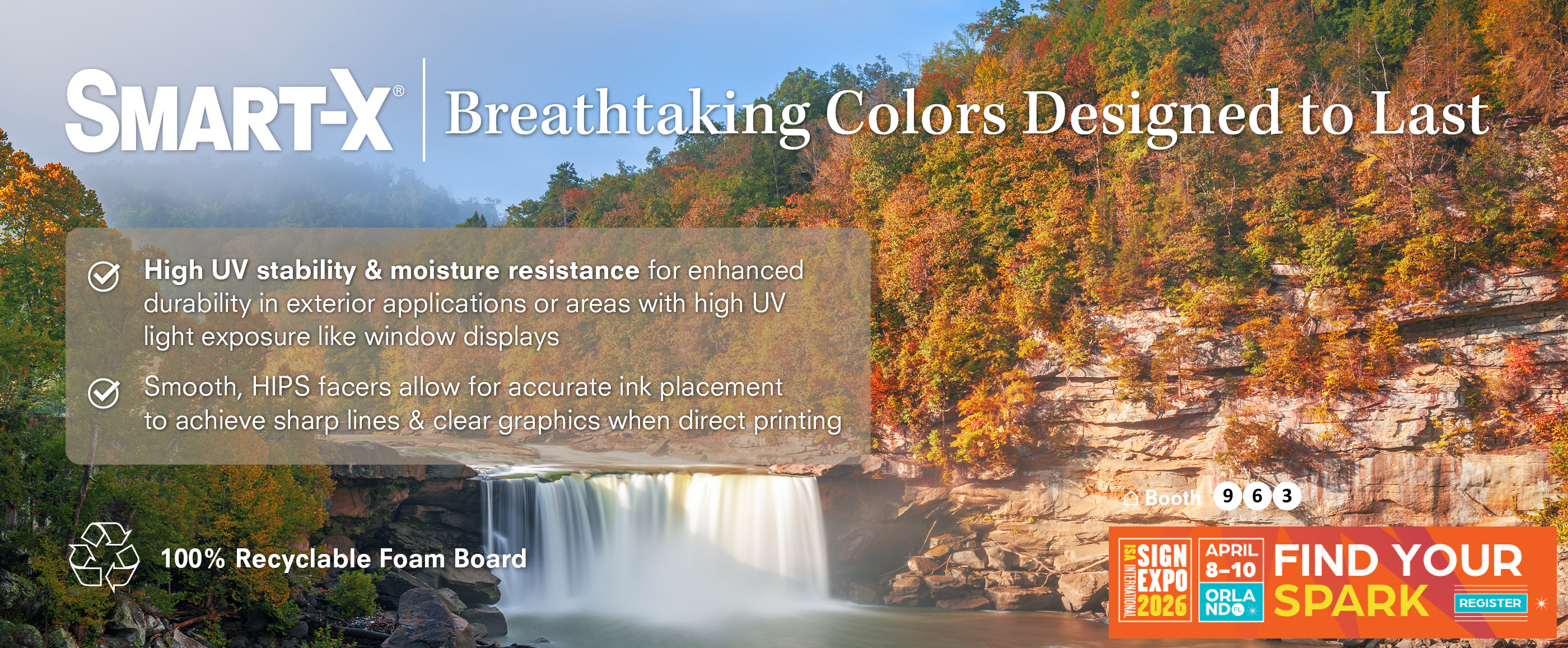 SMART-X® is a lightweight, 100% polystyrene foam board with UV and weather resistant solid polystyrene (HIPS) facers and an expanded polystyrene core that is completely moisture-resistant, creating an excellent solution for exterior applications. Additionally, because there is no adhesive between the core and facers, SMART-X is a 100% recyclable solution for more sustainable promotional campaigns.
